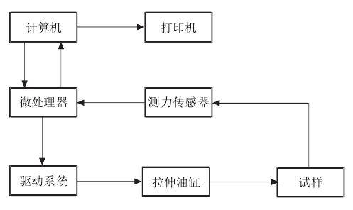 3000 kN拉力试验机系统是一个闭环控制系统,其工作程序是由计算机通过用户设定的数值传输给微处理器,经微处理器将输入的数字信号转变为电信号传输给驱动系统,驱动系统接收电信号后控制拉伸油缸进行试件的拉伸试验,此时压力传感器将试件承受的拉力转变为电信号保存并上传给微处理器,经微处理器将接收的电信号转变为数字信号上传给计算机,计算机接收微处理器上传的反馈信息后,经计算机软件处理转变为线性表格存储并由打印机输出。3000 kN拉力试验机系统工作程序如图所示。
